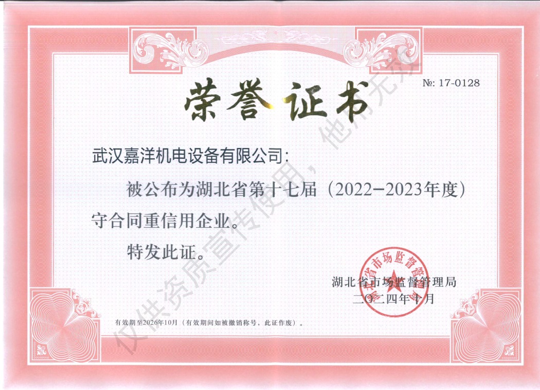 榮獲2022-2023年度省、市“守合同重信用企業(yè)”,也是嘉洋機(jī)電第五次獲得該殊榮。